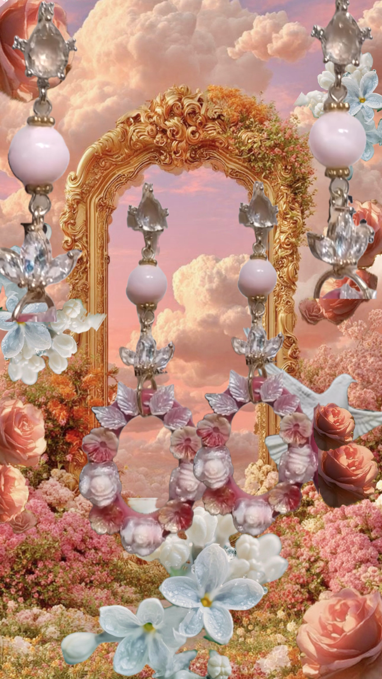 ✨晨曦花園💐 用了UV光變色小葉子+樹脂花花圈 遂片葉子同花花貼上花圈 再加上閃閃鋯石做的小冠冕 清新又帶少許奢華 加上粉色摩根石圓珠襯托 如夢幻花園般夢幻又浪漫的雙重感覺 925銀鋯石耳針 重量:輕 長度:約9cm