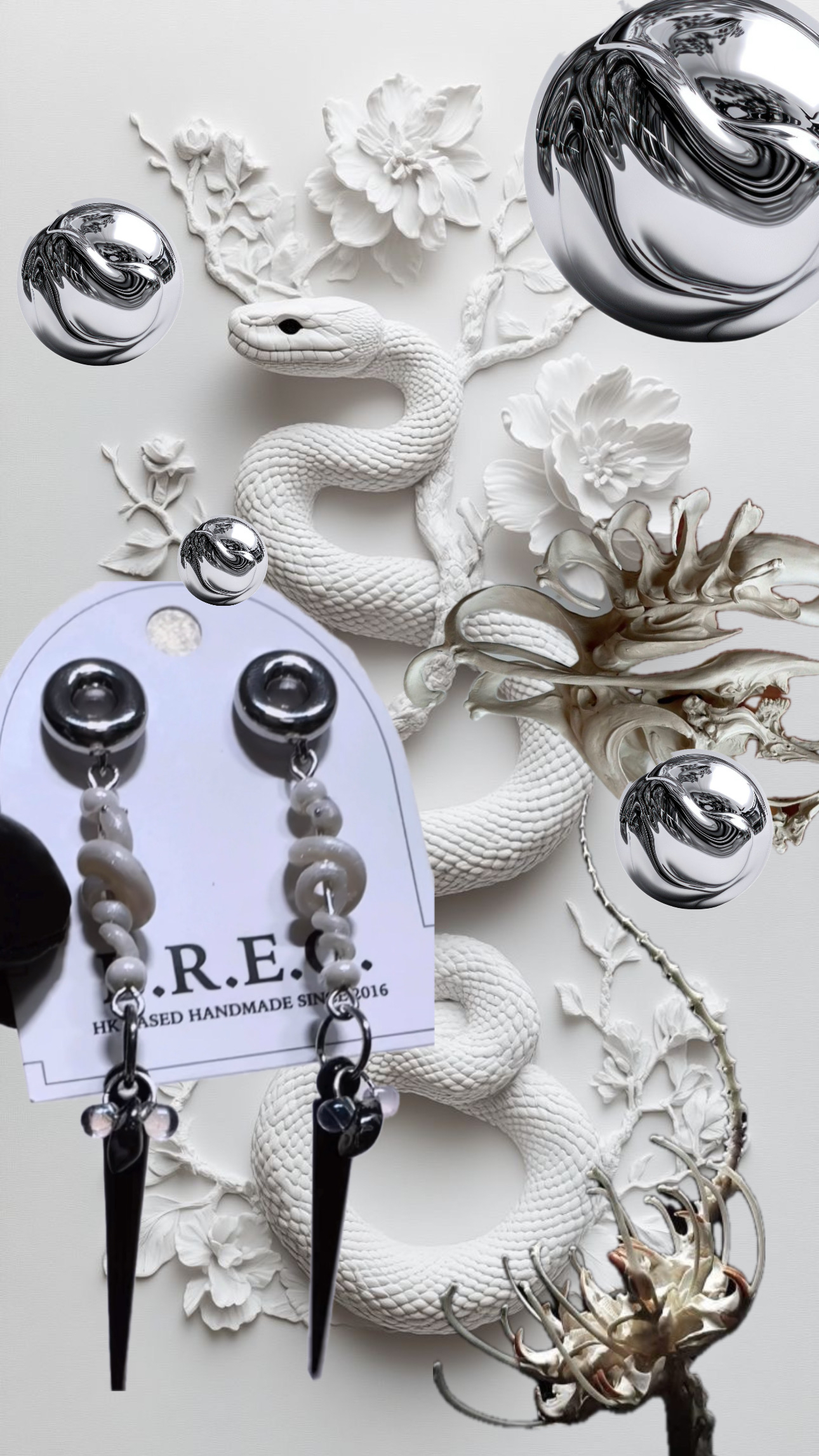 手作軟陶珠光白蛇+日本玻璃珠+樹脂鉚釘 925銀耳針 重量:輕 長度:長約8cm