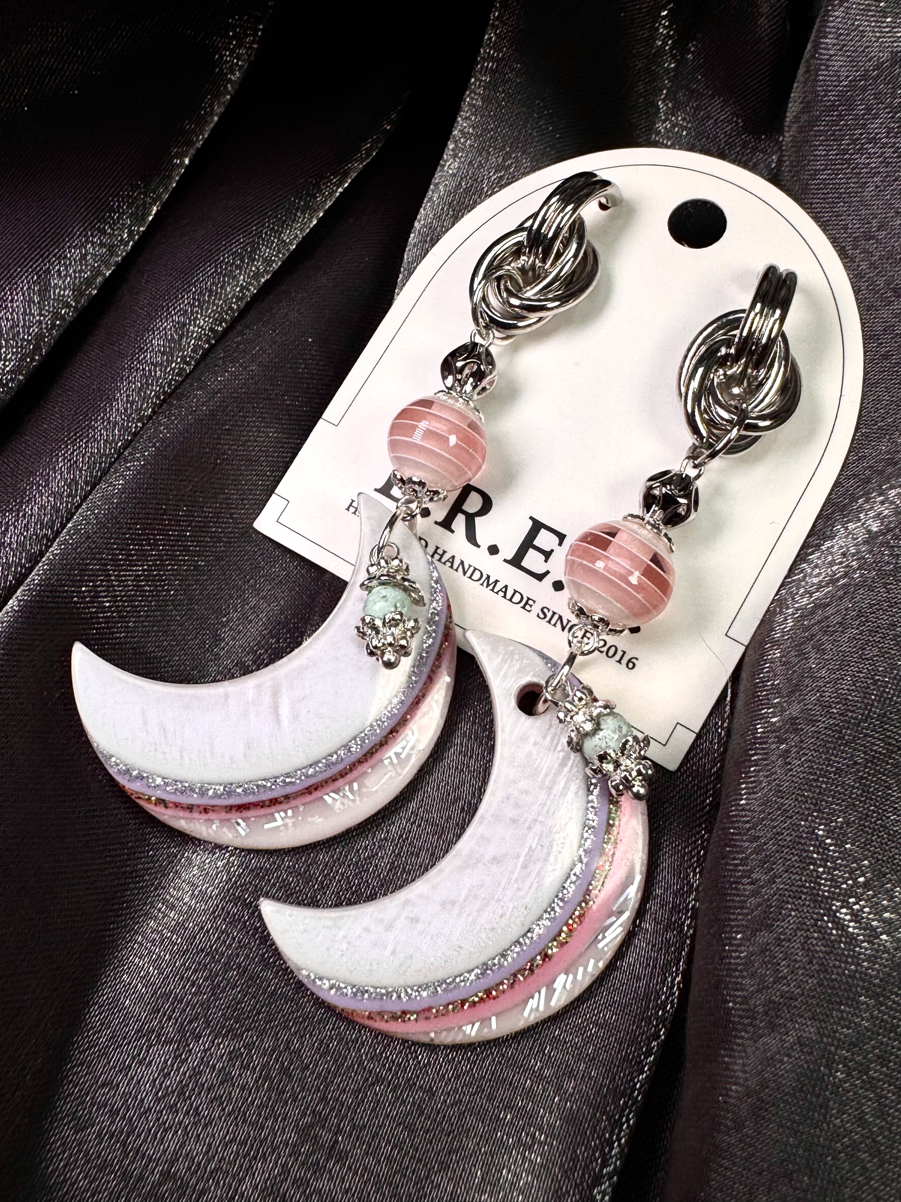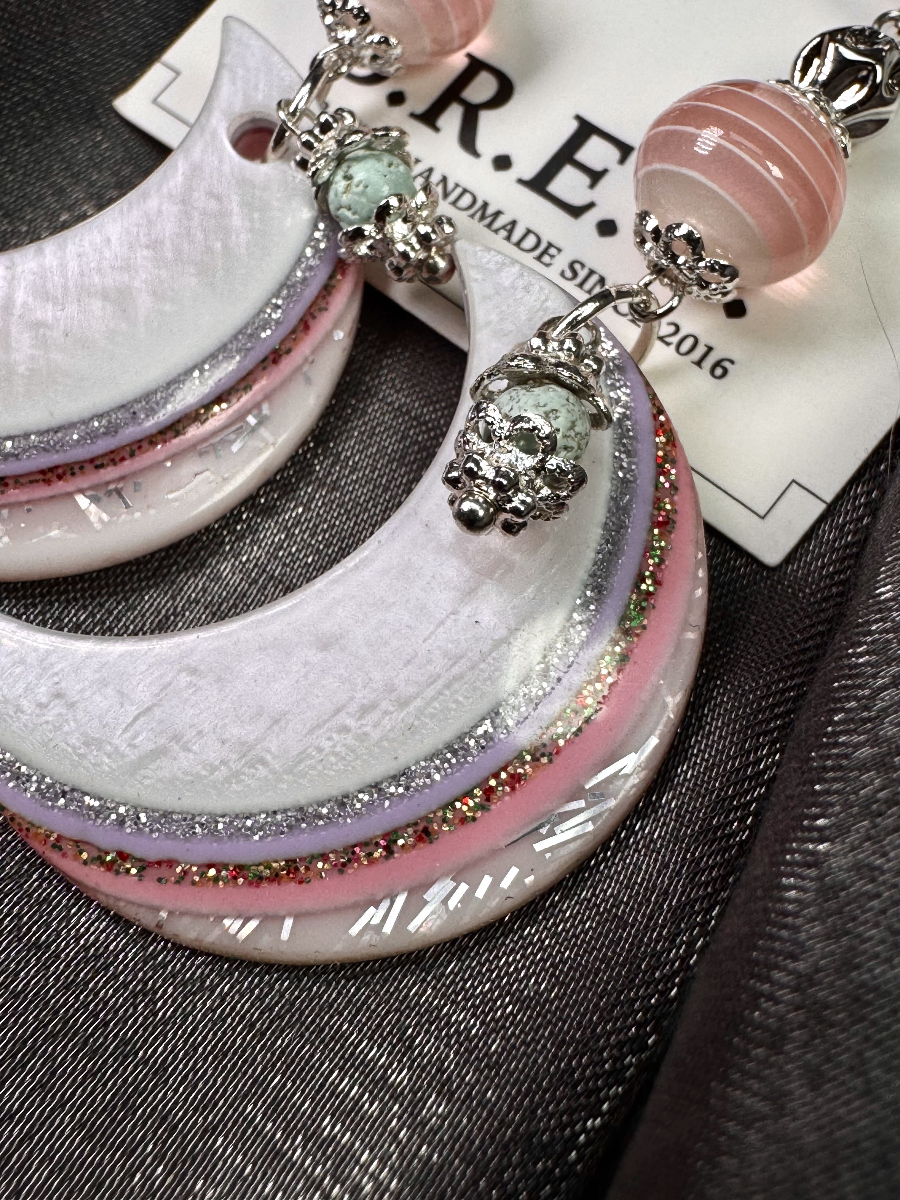 粉紅彎月 閃閃樹脂片+糖果珠 925銀耳針 重量:輕 長度:約9cm