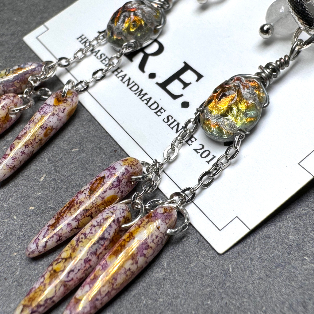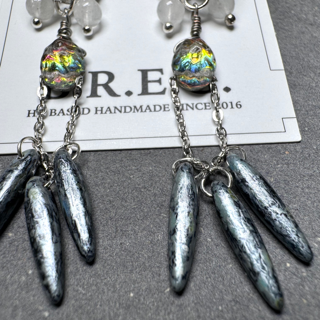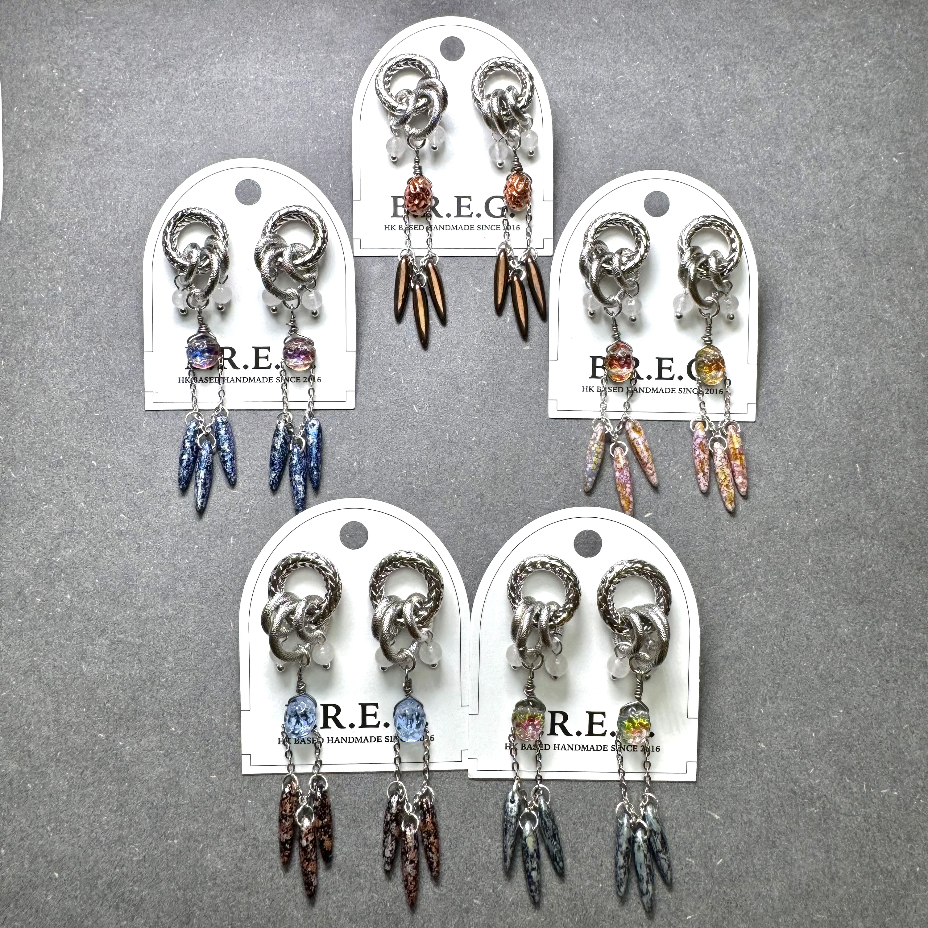 材質:龍紋環耳釘/925銀耳針/鍍彩蛋形玻璃珠/鍍彩玻璃尖珠/白水晶珠 重量:一般 長度:約7cm